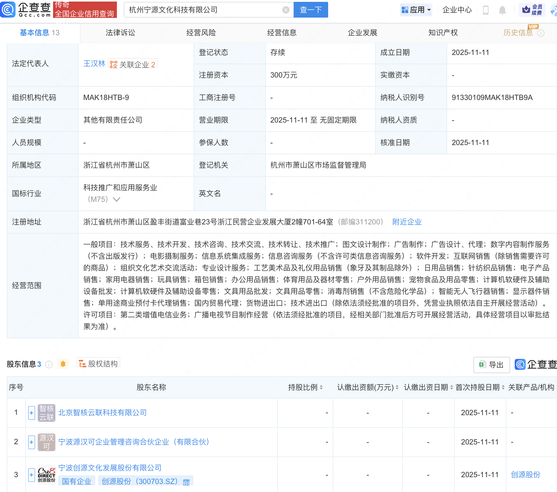 近日,杭州宁源文化科技有限公司成立,法定代表人为王汉林,经营范围包含:智能无人飞行器销售;显示器件销售;单用途商业预付卡代理销售等。企查查股权穿透显示,该公司由创源股份(300703)等共同持股。