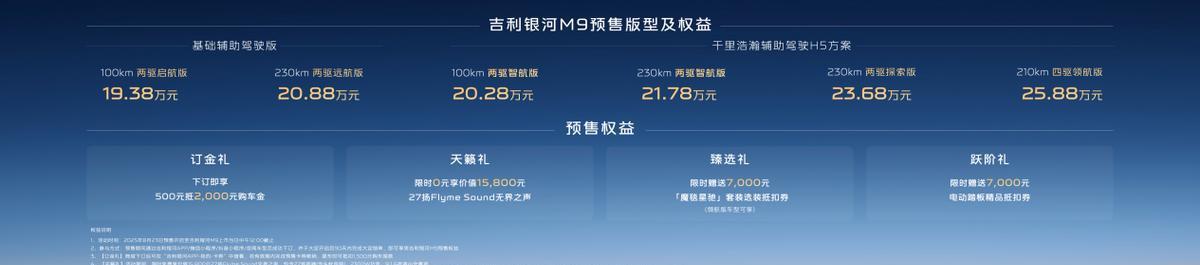 8月23日稳益配,吉利银河旗下首款“AI科技大六座旗舰SUV”——吉利银河M9正式开启全球预售,共推出6个版型,分别为210km四驱领航版、230km两驱探索版、230km两驱智航版、100km两驱智航版、以及230km两驱远航版、100km两驱启航版。预售价格为19.38万元——25.88万元。