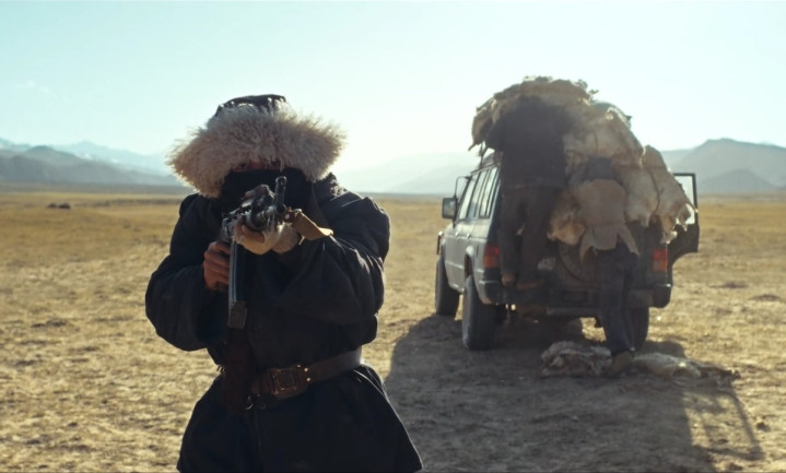 几枪过后,盗猎分子的车上皮子掉落,双方展开枪战对决。