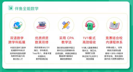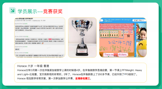 在 “轻负担” 的基础上,伴鱼全能数学通过科学的课程设计与优质的师资配置,保障 “高提分” 的效果。教师录取合格率低于 2%,100% 持有教师资格证,平均教学经验 5 年以上,不乏 985/211 院校毕业生、海归硕士和华杯赛优秀教练,擅长用启发式教学引导孩子思考,让课堂学习高效又有趣;课程以皮亚杰认知发展理论为底层设计,贴合孩子的认知规律,拒绝拔苗助长,从低龄段的趣味互动到高年级的逻辑推理,循序渐进提升孩子的数学能力,平均学习 9 个月便能实现一个阶梯的提升,校内提分、竞赛获奖水到渠成。浙江一年级学员高辰,仅将伴鱼课程作为唯一的数学课外班,2 年学习 193 节课,便从数学兴趣发展为特长,斩获 “希望杯” 国际思维挑战赛全国一等奖,真正实现了 “轻负担学出好成绩”。